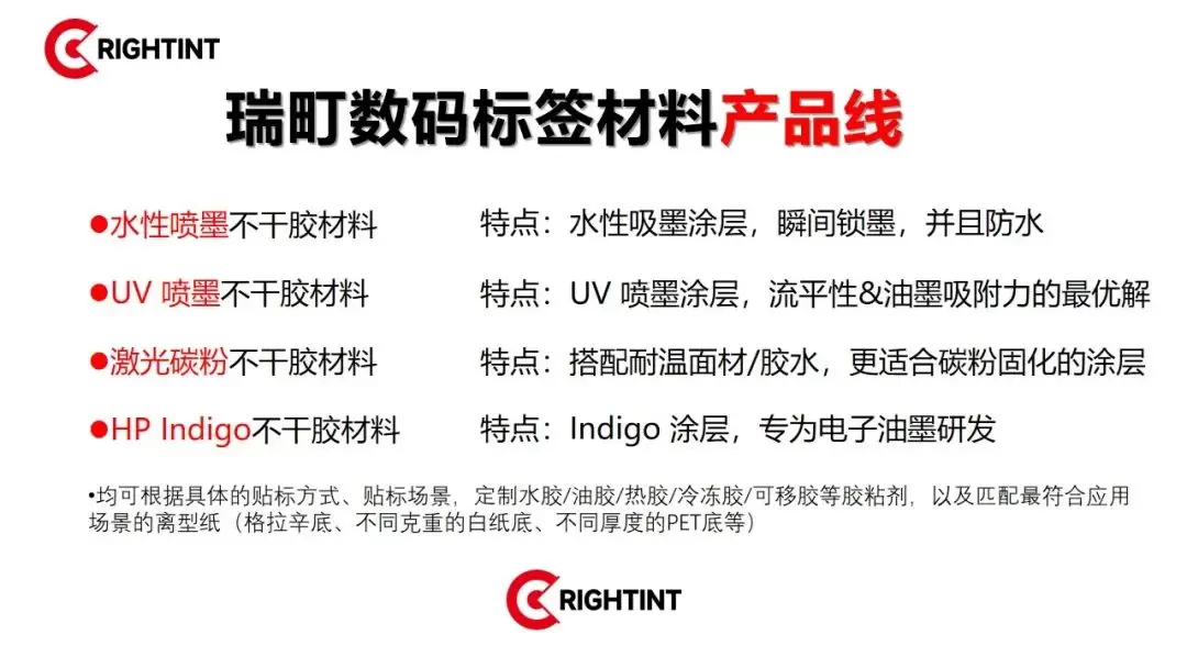 2、专业匹配的数码标签材料产品线: 瑞町提供针对不同印刷技术优化的全系列数码不干胶材料: